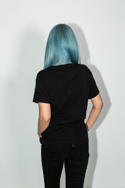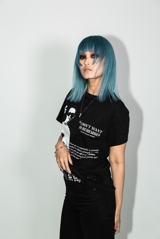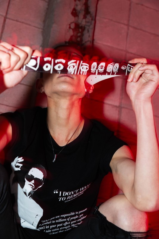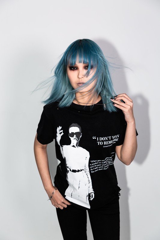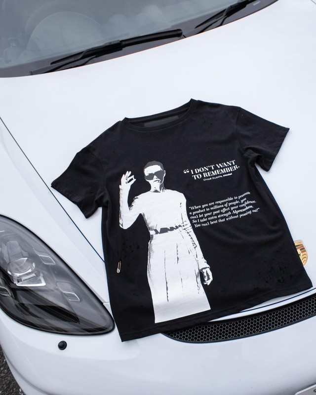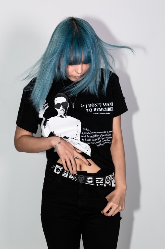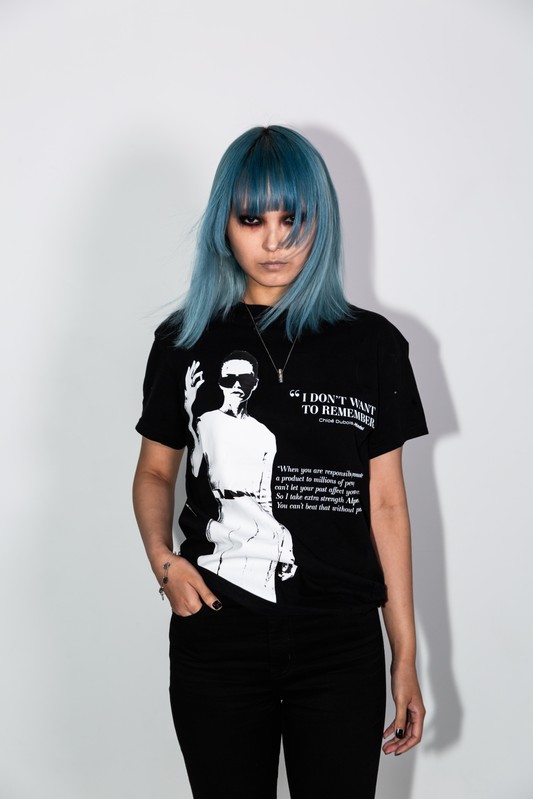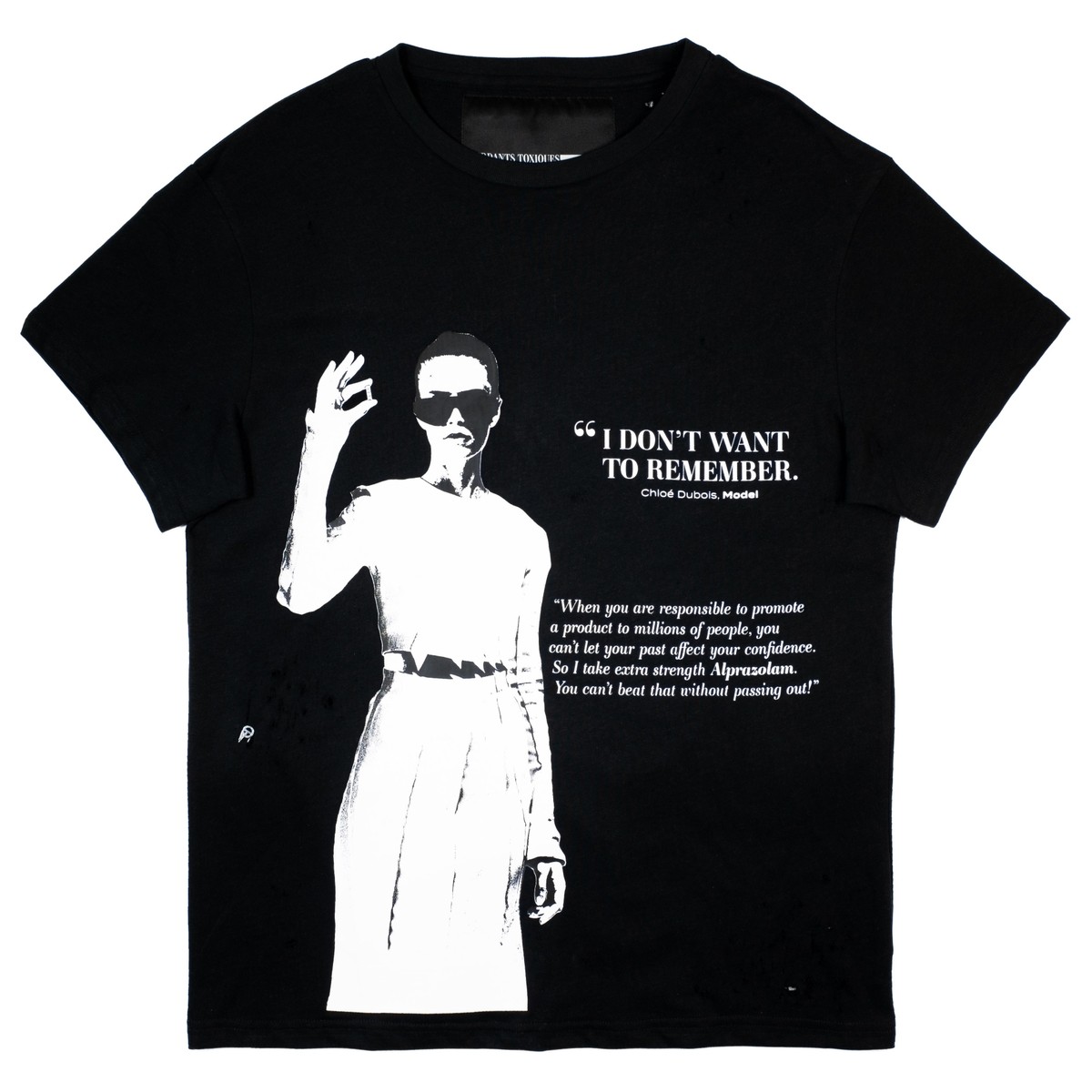 This tee is about my relationship with the anxiety medication alprazolam - a benzo, that especially when overused, can create blackouts and will also simply make you not care about any insecurities. A feeling that can be feel incredibly freeing, when really it puts you in a whole new prison.
