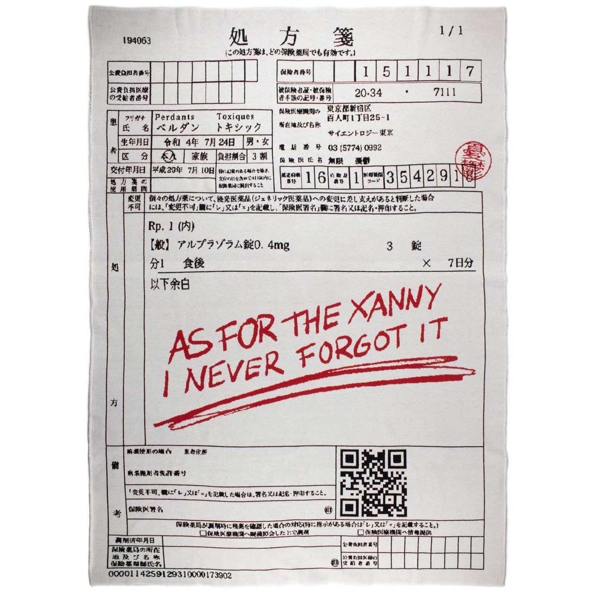 The blanket is a recreation of the real first prescription coupled with a quote by Future that always strongly resonated with me and my feelings regarding this medication: As for the xanny… I never forgot it.