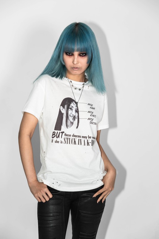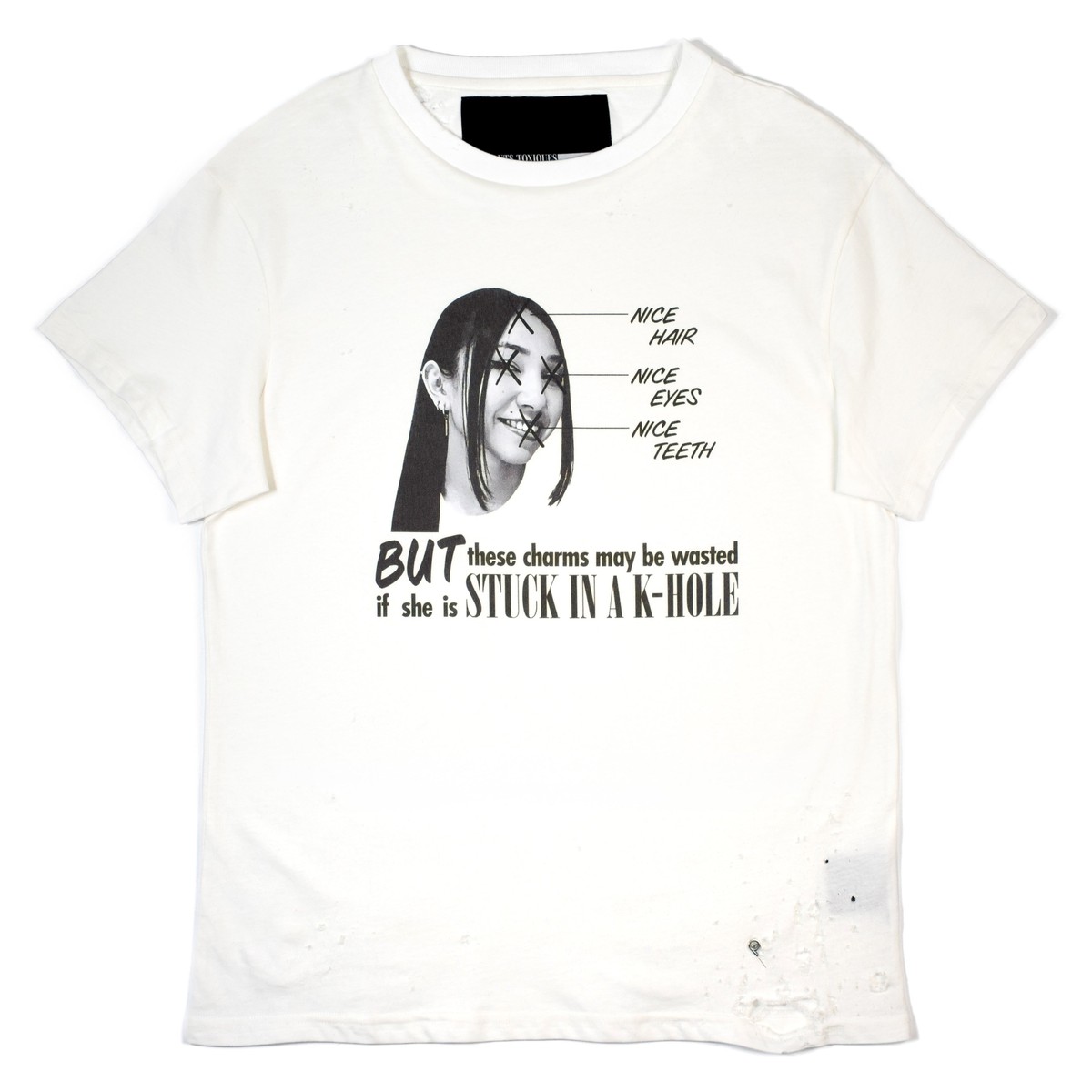 This tee is centered around being an absurdist warning about the dangers of ketamine abuse. You’re probably around the wrong people if you have to worry about your appearance while kholing though.